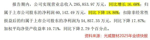 字据功绩快报,光威复材2025年结束营收28.59亿元,同比增长16.68%;净利润6.01亿元,同比着落18.86%,堕入功绩增长逆境。