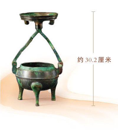 1974年出土于甘肃省平凉市庙庄村战国秦墓的鼎形铜行灯,现藏于甘肃省博物馆。它由盖、键、耳、身4部分构成,支起时高约30.2厘米,收合时仅高约16.7厘米,口径11.3厘米,工致便携,是战国贵族出行时的困难照明器具。